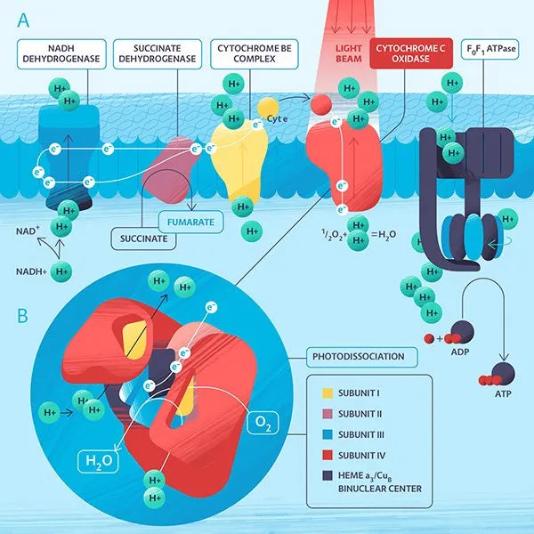 Laser light stimulates light sensitive matter within cell to create a series of photochemical reaction generating matters of ATP,ROS,NO for healing of cells
